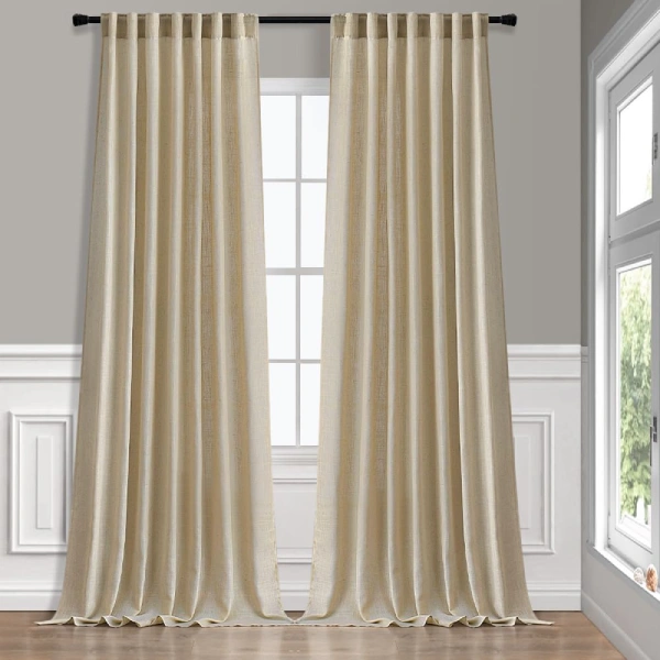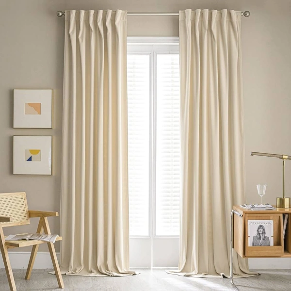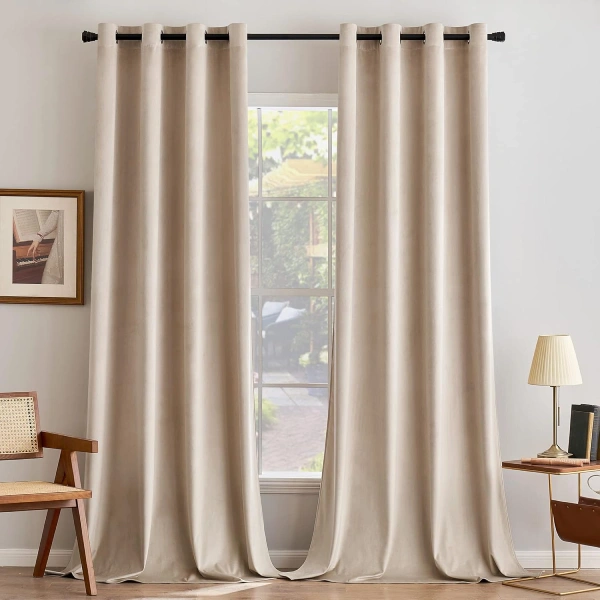 Linen beige draperies offer a soft, airy feel, giving the interior a calming feel and allowing gentle light fusion. Velvet beige drapes offer a luxurious texture that allows for better insulation and blackout capability.