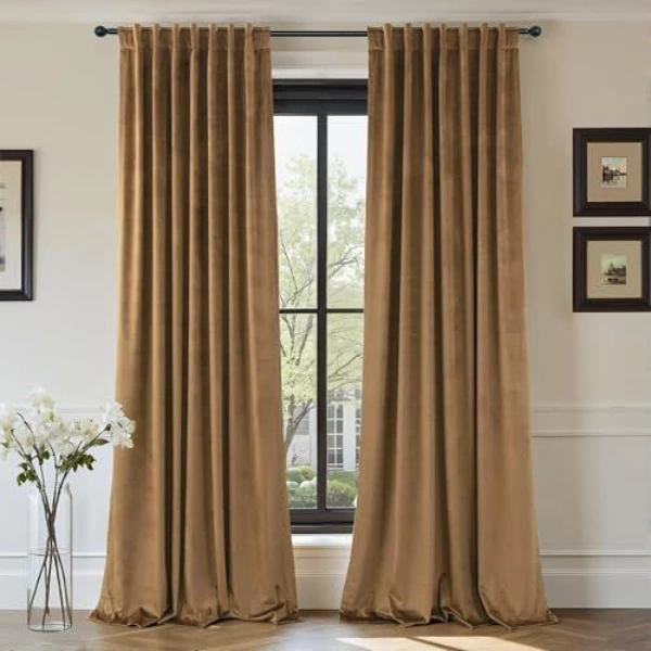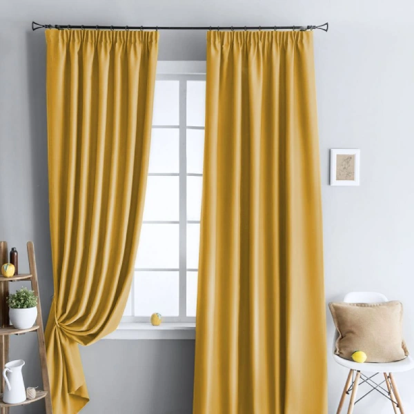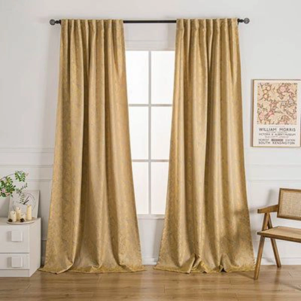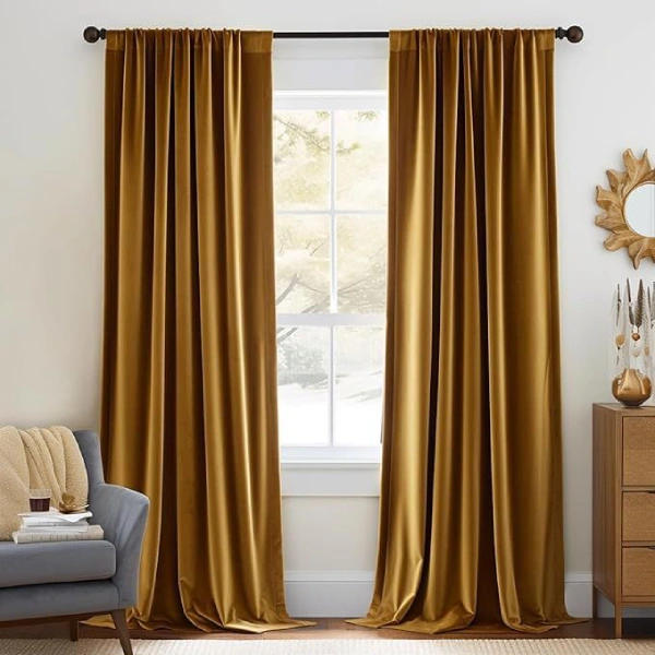 These drapes in gold-colored fabrics work best for both living rooms and bedrooms. In the bedroom, you can pair them with a blackout lining for total darkness. As for the living rooms, you can directly use light golden fabric sheer curtains for a touch of warmth and ambient glow.