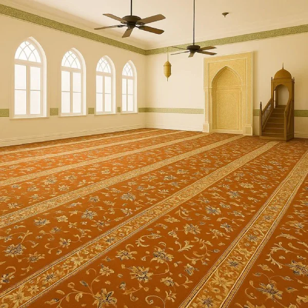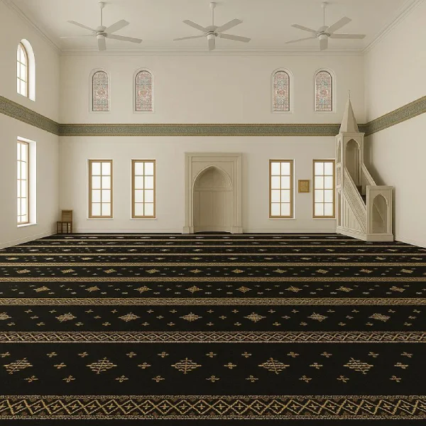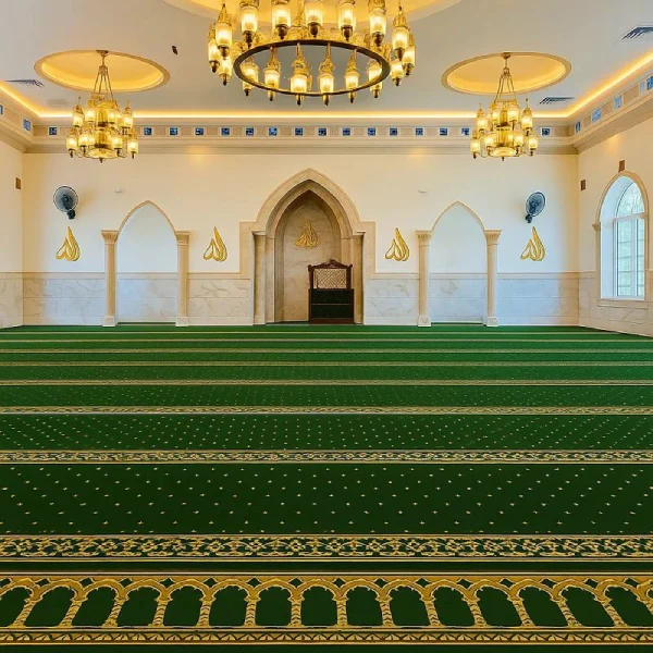 There is a long list of materials for mosque carpets, but for Sharjah, we recommend options like wool, nylon, and polypropylene. The best choice is polypropylene, which is both affordable and has strong stain resistance, with softness and durability for high-traffic areas.