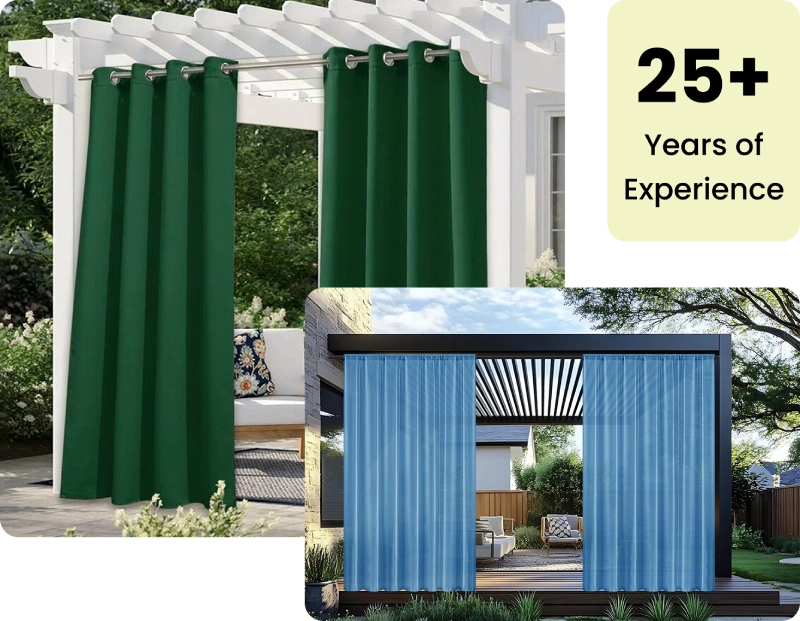 Customize drapes to allow full coverage for patios, balconies, and outdoor pergola curtains without gaps. Create your stylish outdoor privacy curtains with varying levels of fabric opacity.