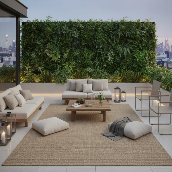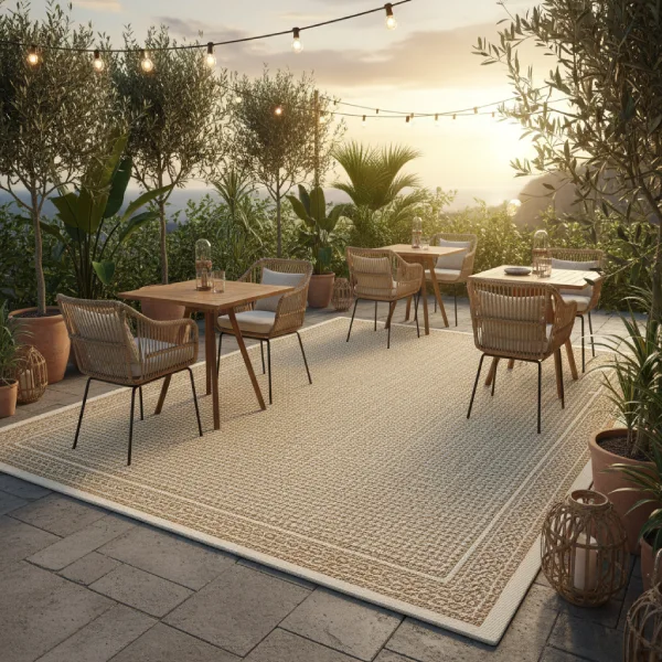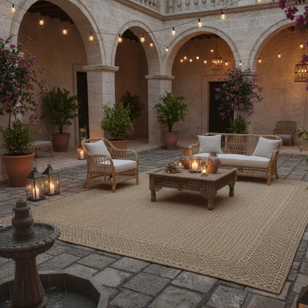 Polypropylene is the best material choice for outdoor rugs. It’s exceptionally durable and can withstand stain damage without fading due to sunlight. It can also endure high moisture and increased foot traffic.