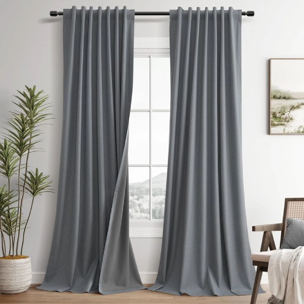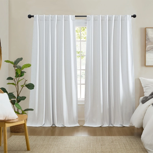Heavyweight linen-blend white blackout curtains in 18 colors, designed to quietly transform your space. The rich linen texture paired with a blackout backing blocks light, softens sound, and creates a calm, cocoon-like feel. When opened, they blend effortlessly into the room—subtle, refined, and exactly where they belong.
