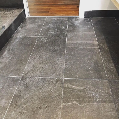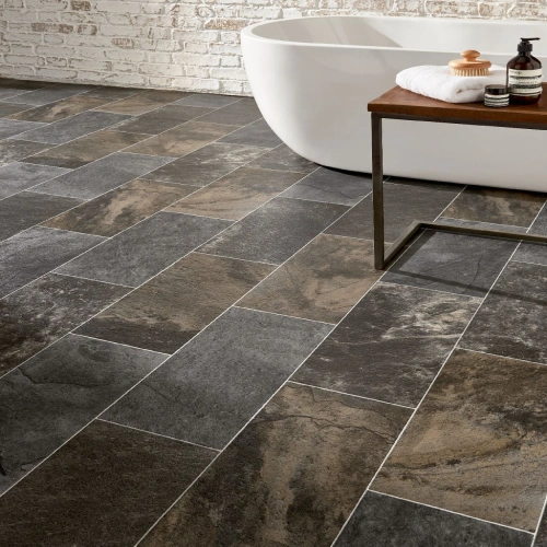 Bring elegance with Remmington Vinyl Floor Tiles. Slate grey, taupe, and smoke-blue tones create a natural stone look, while its durable, slip-resistant, and warm design suits kitchens and bathrooms.