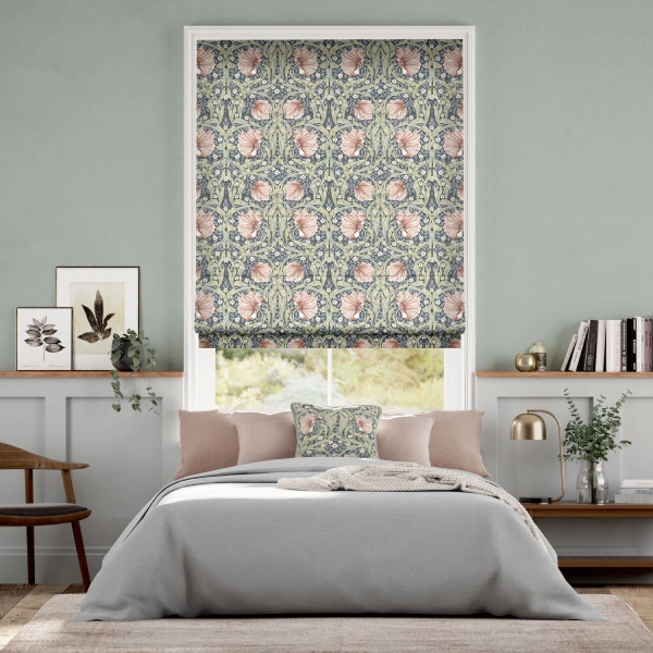 The William Morris Pimpernel Blush Roman Blind adds graceful floral beauty to any room. Featuring soft blush tones with muted blue and green accents, it creates a warm and timeless look. Custom made to measure, it offers smooth operation with optional upgrades for a sleek, modern finish.